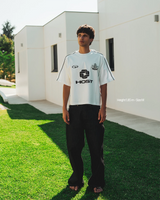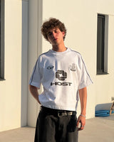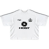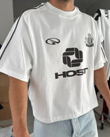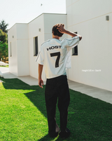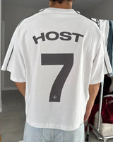 Features a digital print on the front with the HOST® logo and multiple chest emblems. Double-layer sleeve panels with grey stripe detailing along the shoulders. Back design showcases the HOST® lettering with the number 7, finished with a minimal Icon Flower detail.