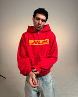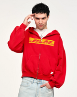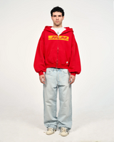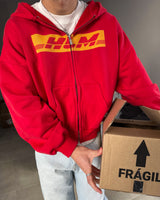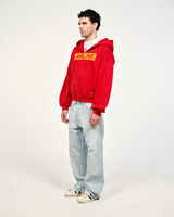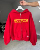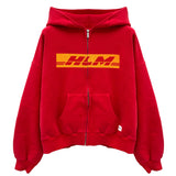Washed red zipper hoodie 'HLM' yellow logo printed on the front. Metal custom logo zipper puller. Icon flower pocket label.