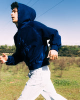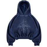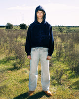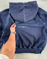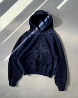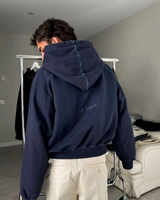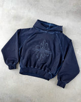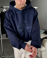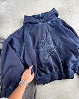 Dyed & washed vintage faded navy hoodie 'ICONFLOWER logo' dyed color Chain Embroidered on the front. "LAMAISON" dyed color Chain embroidered on the back.