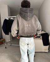 Ripped details throughout the garment. This piece has been reconstructed by hand generating this vintage effect. The color may vary slightly between different hoodies due to this effect.