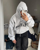 Ash grey hoodie 'LAMAISON' Dark navy blue 3D embroidery. Long cylindrical drawstrings. ©Host corporate color pocket label.