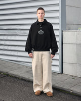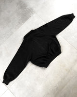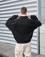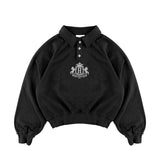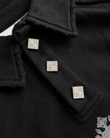 Black crewneck Polo 'Royal Shield' screen-printed in gray color on the front. Metal buttons with engraved icon logos. Distressed and broken details on the neck and seams. 'ICON FLOWER' Chain embroidered on the back in black color.
