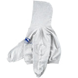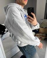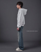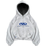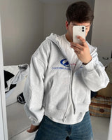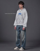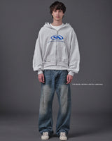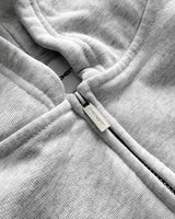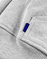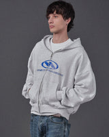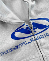 Ash grey Host Lamaison zipped hoodie 'HOSTLAMAISON' Electric blue logo printed on the front. Metal custom logo double zipper puller. ©Host corporate color pocket label. Wavy shaped sleeves seams.