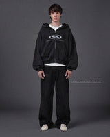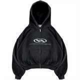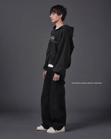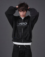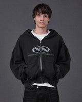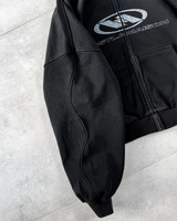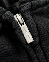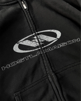 Washed black Host Lamaison zipped hoodie 'HOSTLAMAISON' grey logo printed on the front. Metal custom logo zipper puller. ©Host corporate color pocket label. Wavy shaped sleeves seams.