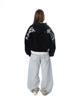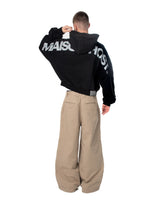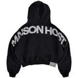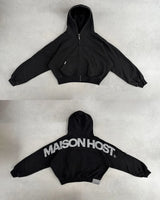 Features a full-length metal zipper, curved seam construction, and an oversized MAISON HOST® back print running from the left sleeve across the hood to the right sleeve. Includes a metallic MAISONHOST® side tag on the pocket and an grey leather patch with embedded metal lettering on the back waist.