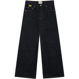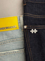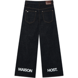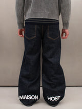 Rigid denim, featuring a MAISON HOST print on the lower back, a metal cross logo on the left back pocket, and branded metal rivets throughout.