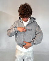 Signature Wavy Arms curved sleeve construction. Double metal zipper engraved with MAISONHOST®, front print and tonal back embroidery.