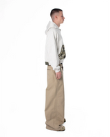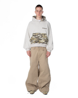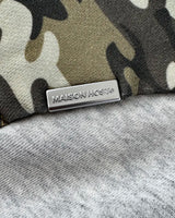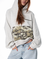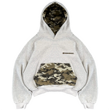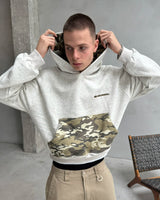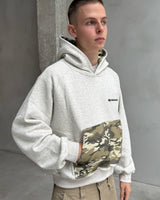 The hood’s inner lining and front kangaroo pocket feature a camo print panel, introducing a distinct contrast of texture and tone.