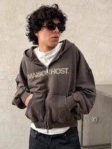 Signature Wavy Arms curved sleeve construction. Double metal zipper engraved with MAISONHOST®, front print and tonal back embroidery.